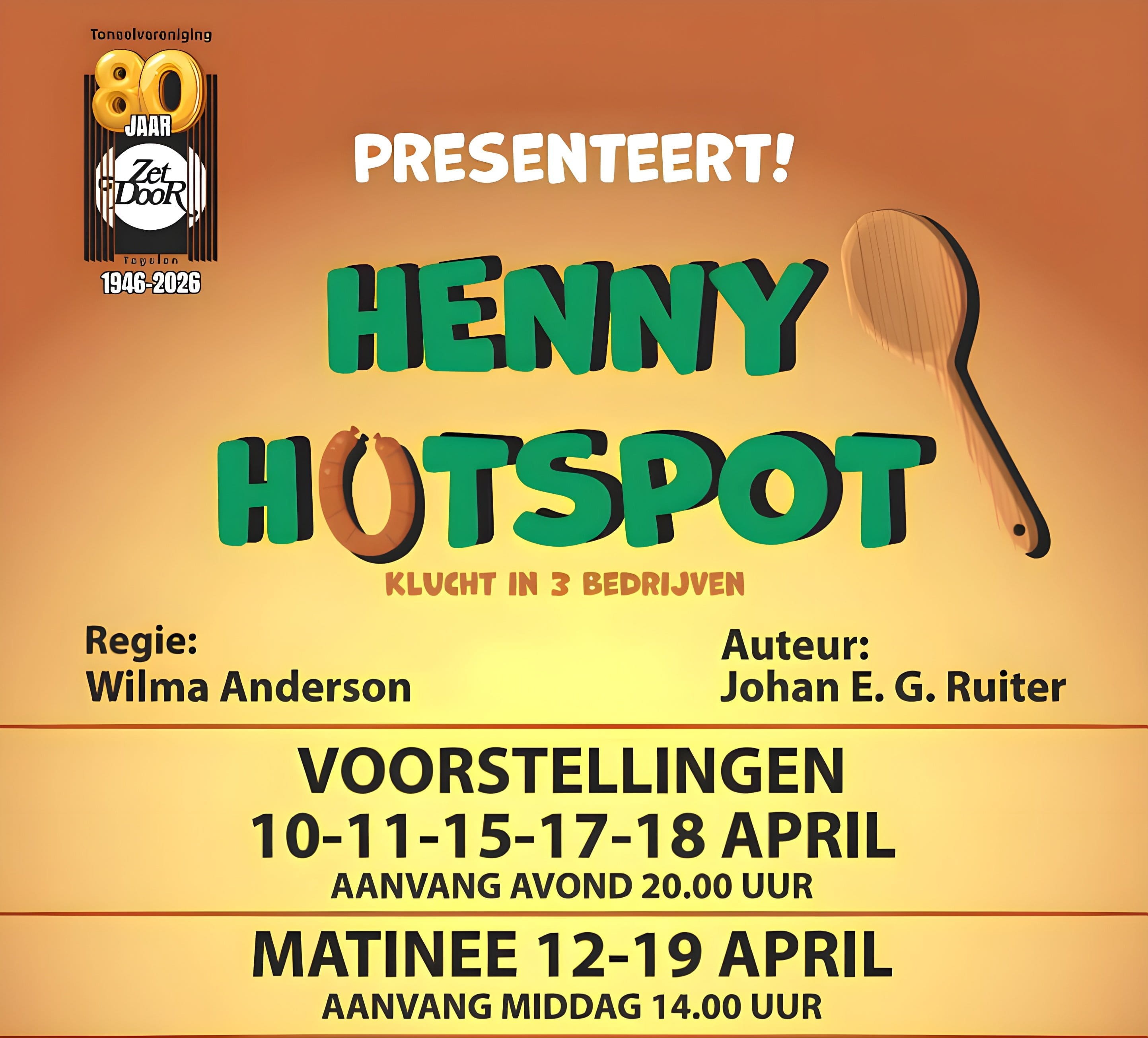 “Henny Hutspot” is een klucht die zich afspeelt in een pension dat Henny samen runt met haar man Geert, de kamers worden al een lange tijd verhuurt aan enkele vaste bewoners met allemaal hun eigen gewoontes en eigenaardigheden. Als Henny mee gaat doen aan een wedstrijd voor de televisie komt zij onverwacht in het middelpunt van de belangstelling te staan. In het pension ontstaat daardoor onrust, want wat heeft dit voor gevolgen. De mensen om haar heen hebben allemaal hun eigen belangen, geheimen en plannen. Iedereen probeert de situatie naar zijn hand te zetten, wat zorgt voor een reeks misverstanden, leugentjes en hilarische verwikkelingen. Deze voorstelling zit vol grappige dialogen en chaos achter de schermen. Al met al een luchtige klucht, die weer voor een lachwekkende voorstelling zorgt.